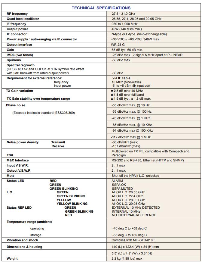 ¨ Output frequency 27.5-31.0 GHz ¨ Based on GaN technology which enables high effi ciency, low power consumption and high reliability. ¨ Quad- L.O. (electronicaly and manually switchable 26.55, 27.4, 28.05, and 29.05 GHz) ¨ Low power consumption (340W max) ¨ M&C - combined RS-232/485, FSK and Ethernet control (HTTP and SNMP) ¨ L.O. lock, amplifi er and 10MHz LEDs ¨ Built-in redundancy option ¨ Field-exchangeable (F/N) IF connector ¨ Internal 10MHz high stability reference autosensing and controlable (optional) ¨ RoHS compliant